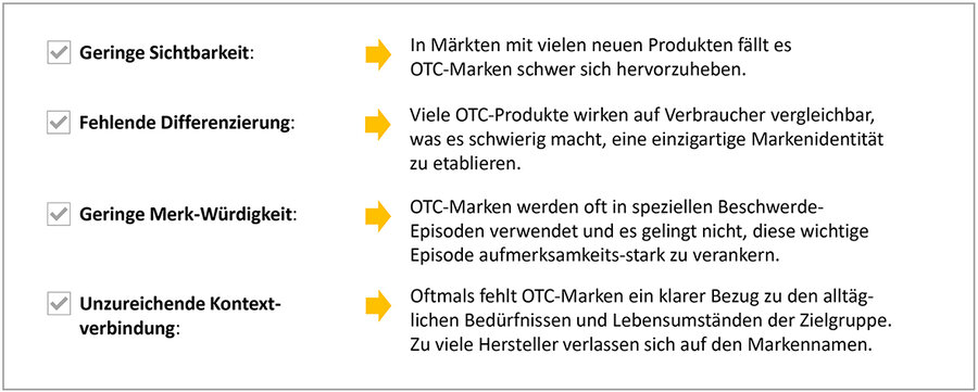 Ein zentrales Problem für OTC-Marken ist also die mangelnde Markenbekanntheit und das Fehlen von prägnanten Brand Assets. Viele Marken verfügen nicht über eindeutiges Branding, was sie austauschbar macht, besonders wenn Verbraucher in Qualität oder persönlichen Nutzen kaum Unterschiede wahrnehmen. Hinzu kommt, dass OTC-Produkte oft als Problemlöser in spezifischen Situationen genutzt und nach der Genesung schnell vergessen werden. Das unterstreicht die Bedeutung des Kontexts für die Markenbindung und die Erinnerung an die Marke.