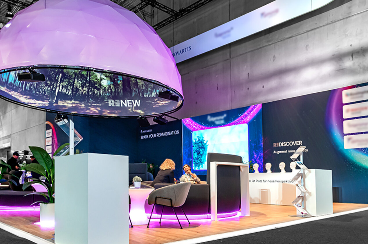 Ein Beispiel für einen Kongressauftritt, der Aufmerksamkeit und Neugier erzeugt, ist das „Imaginarium“, das IPG Health für den Auftritt von Novartis auf dem wichtigsten neurologischen Kongress in Deutschland geschaffen hat. Im Zentrum steht der „Dome“ – eine riesige Kuppel als virtuelles Fenster in eine andere Welt. Wer zur Decke blickt, sieht den Himmel, steht in einem Wald oder blickt in die Sterne – ein Ruhepol im Kongresstrubel. Statt auf kleinteilige Flächen für einzelne Produkte setzt das Konzept auf ein variables Lichtkonzept, das den Stand abwechselnd einem Produkt überlässt. Der Anspruch von Novartis in der Neurologie heißt „Reimagining Neuroscience“ – mit dem Imaginarium werde dieser Anspruch lebendig.