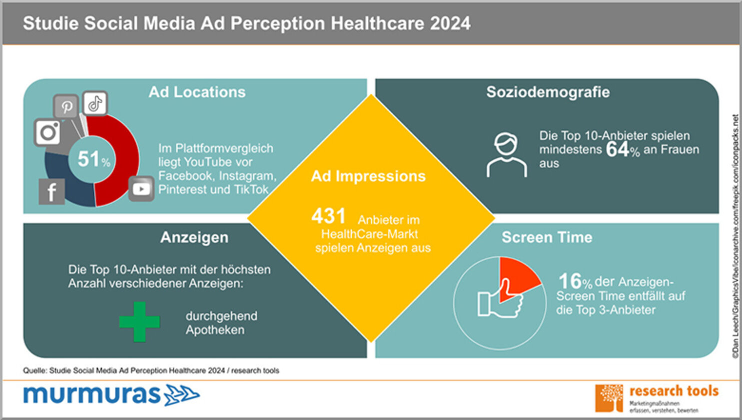 Mittels Smartphone-App monitort das IT-Unternehmen Murmuras die Werbeaktivitäten der Healthcare-Branche auf den Social-Media-Plattformen Facebook, Instagram, Pinterest, TikTok und YouTube. Dabei wird die Ausspielung der Anzeigen erfasst und um verschiedene Informationen wie Soziodemografie, Plattform, Produktkategorie und Anbietertyp angereichert. Zwischen Juli 2023 und Juni 2024 schalteten 431 Anbieter rund 25.000 verschiedene Anzeigen auf diesen fünf Plattformen. Durchschnittlich sahen User etwa alle acht Tage eine Anzeige aus dem Healthcare-Bereich. Auf die Top 10-Advertiser entfallen beachtliche 64 Prozent aller Ad Impressions, mit Bayer, Jasper Caven und Shop Apotheke an der Spitze.